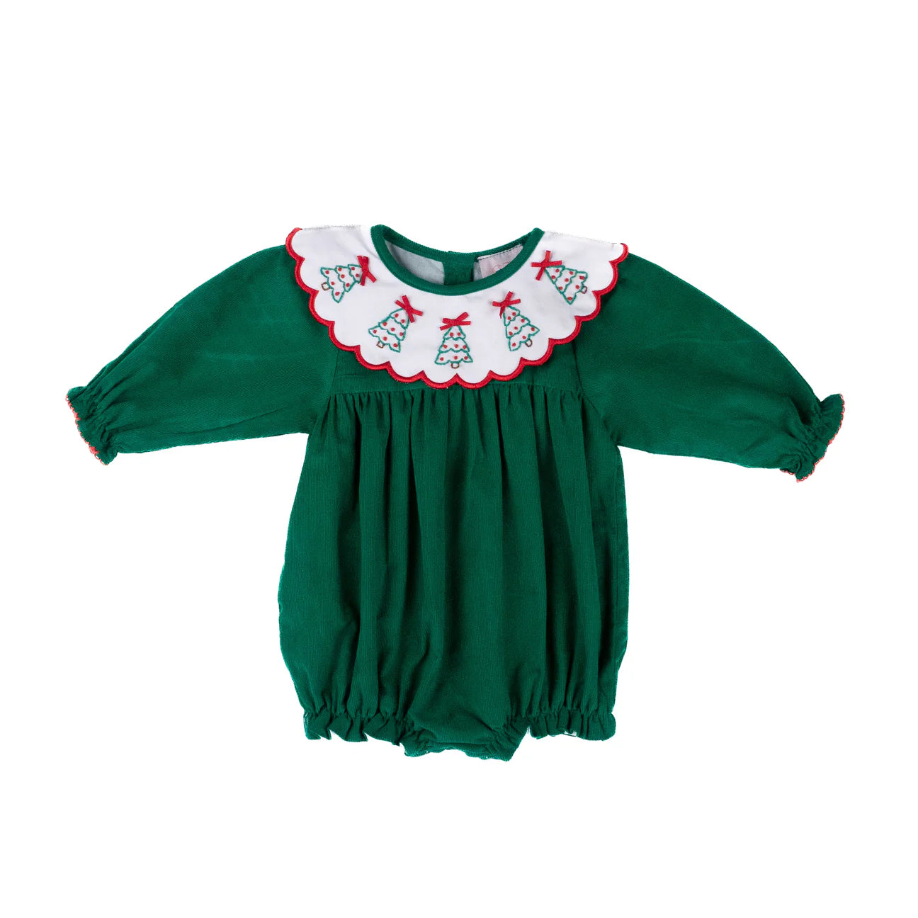 A holiday classic, this bubble is crafted from rich green corduroy and features a crisp white neckline with hand-embroidered Christmas trees. Long sleeves with red stitched trim and gathered leg openings add traditional charm while ensuring comfort. Perfect for Christmas photos, family gatherings, and festive celebrations, this heirloom-quality piece blends timeless style with seasonal spirit.