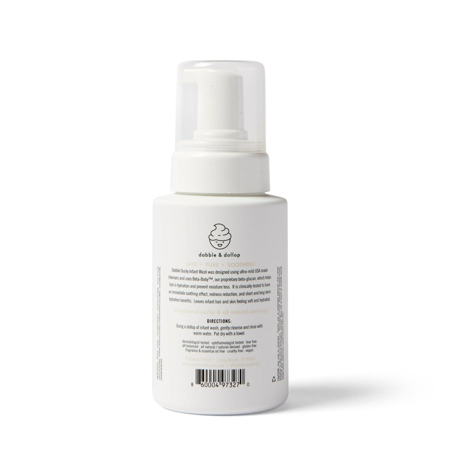Dabble Ducky Infant Wash is an unscented, clear, dye-free, tear-free, hypoallergenic, pH balanced, foaming wash designed for delicate infant skin, eczema-prone skin, and sensitive/dry skin.