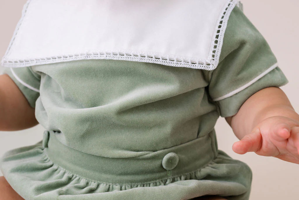 Classic and polished, the Christian Button-On is crafted in rich Leyland Green Velvet and features a refined Winter White Velvet square collar. Designed as a traditional boy's button-on, this heirloom-inspired piece pairs beautifully with coordinating bottoms for holiday gatherings, family portraits, or timeless everyday wear.