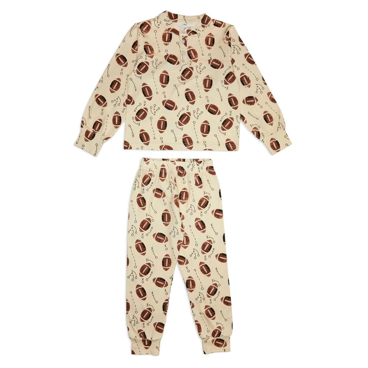 A retro football pattern makes this two-piece kid’s set perfect for wear after a long day on the playground. Soft and incredibly comfortable, it comes complete with a long sleeved top and matching slim fit bottoms.