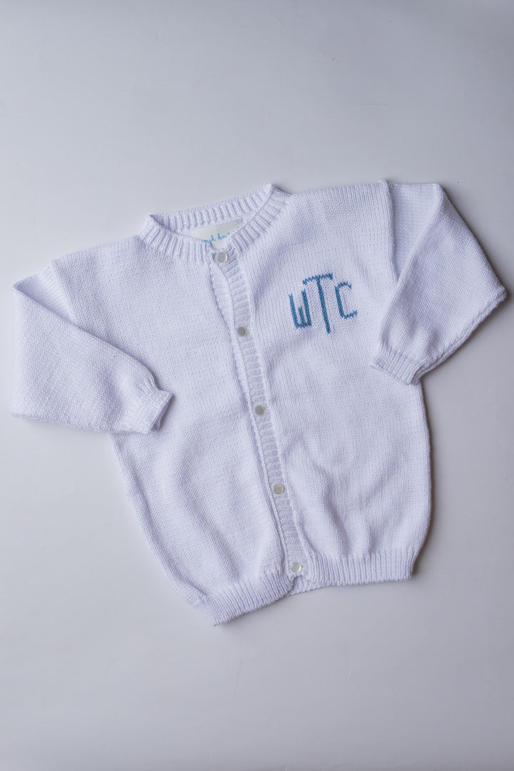 Custom Knit Monogram Cardigan | White with Denim Blue