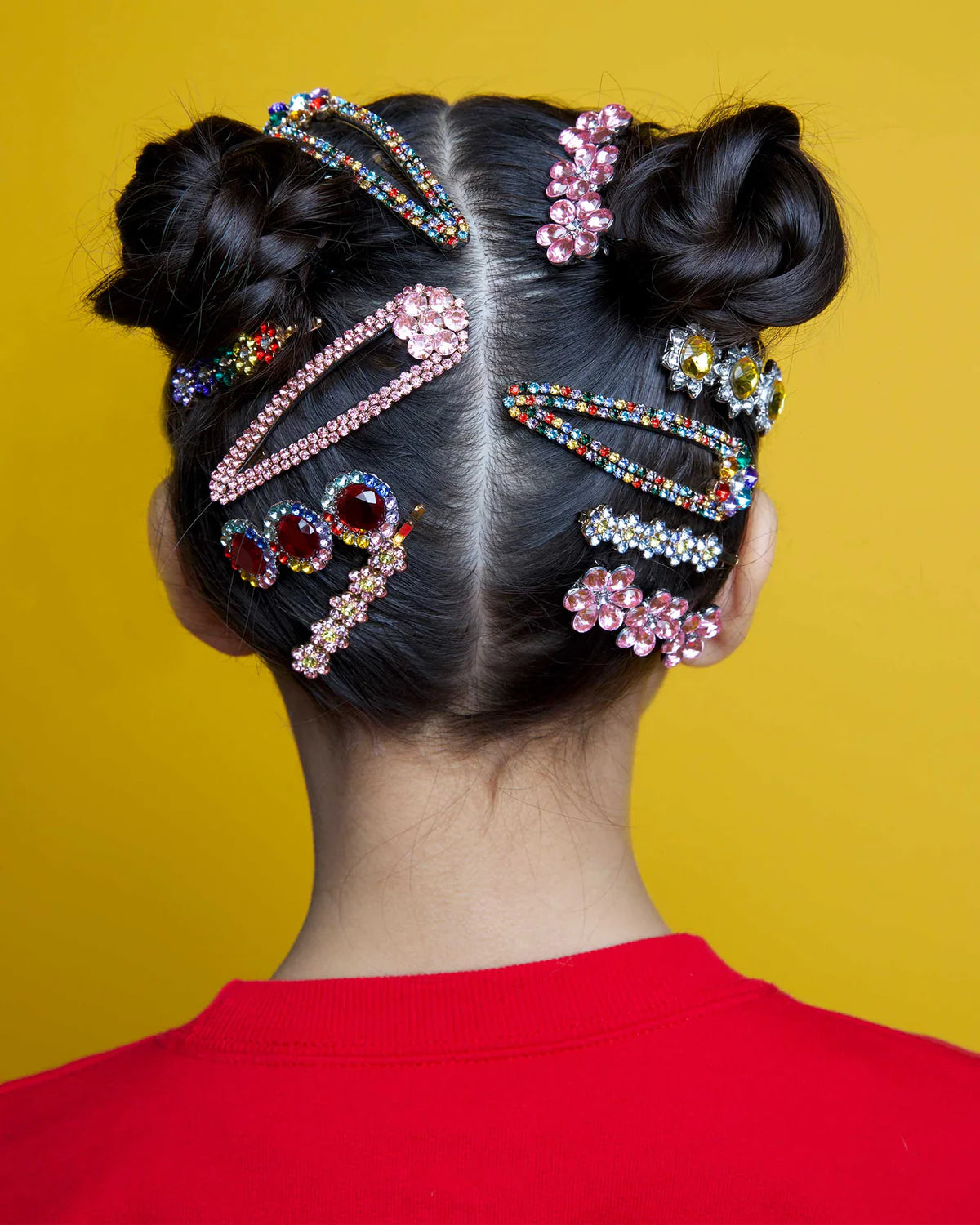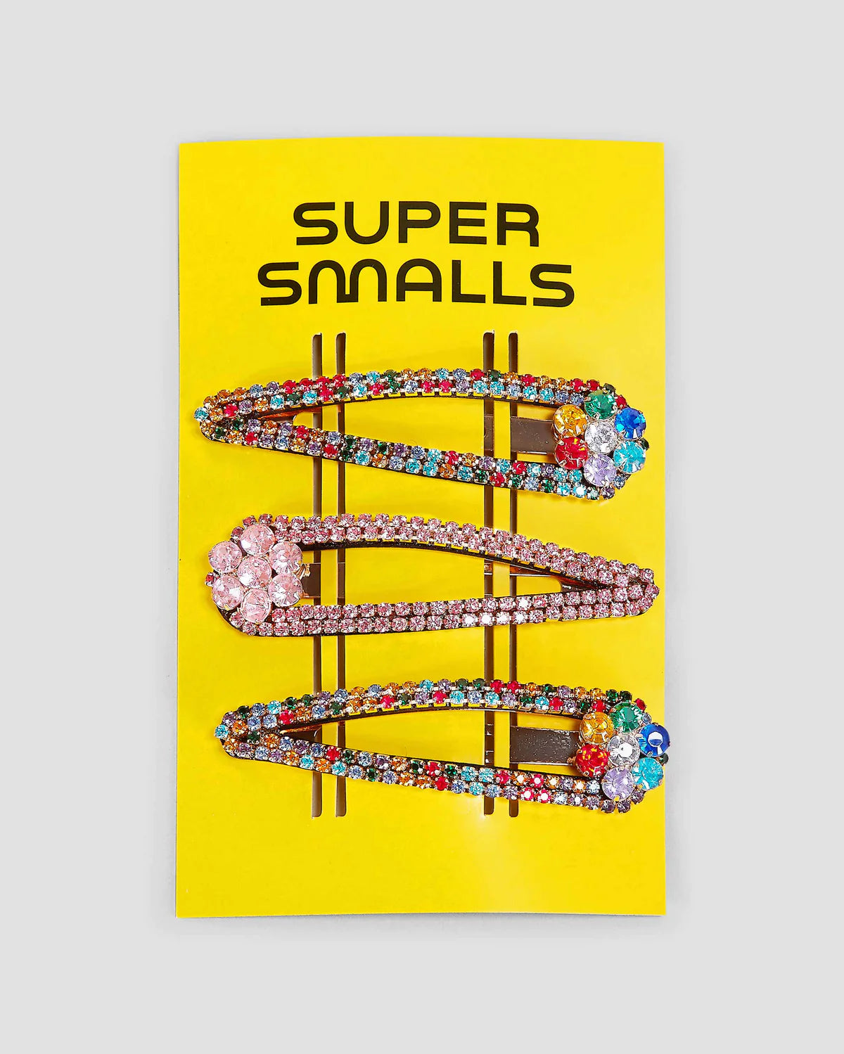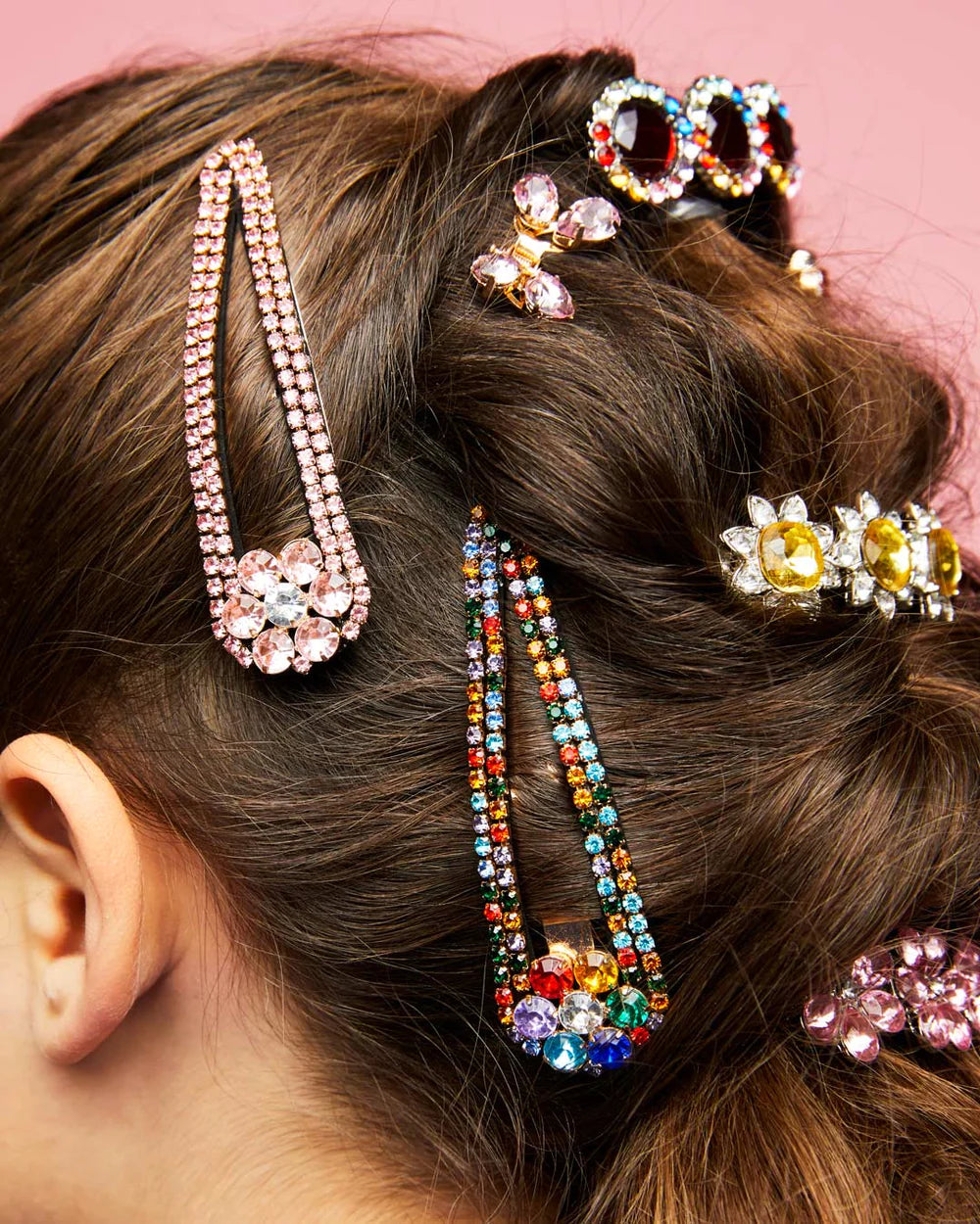 Light up the night sky! This set includes three jewel-covered contour clips—two rainbow and one pink. They snap on-and-off to make keeping hair out of your eyes easy-peasy, while shining super bright. It’s like wearing a shooting star, but better! Wear just one, or pop on all three for an extra sparkly statement.