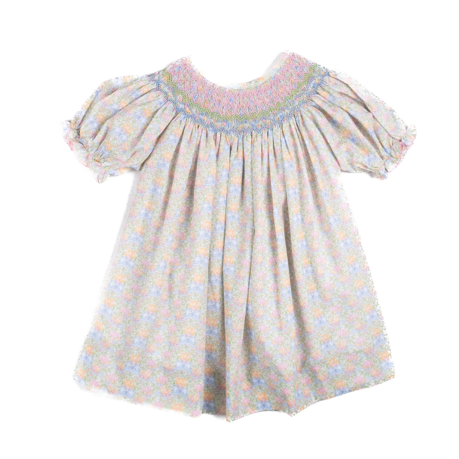 Delicately crafted with timeless charm, this hand-smocked dress features intricate smocking across the neckline and soft puff sleeves with gathered detail. Made from lightweight fabric in a pastel floral print, it drapes beautifully for a classic silhouette. The smocking is skillfully done by hand, ensuring each piece is unique. Perfect for special occasions or everyday elegance, this dress blends comfort with traditional craftsmanship.