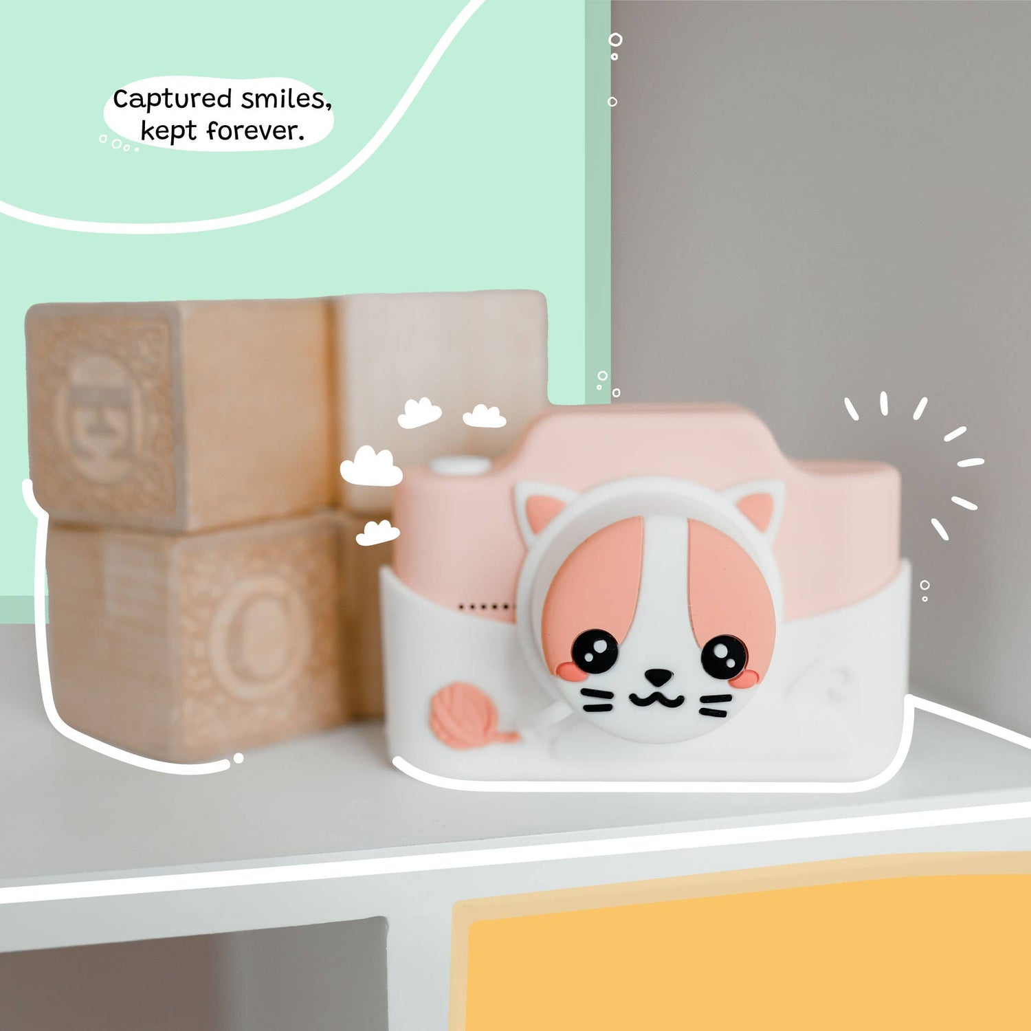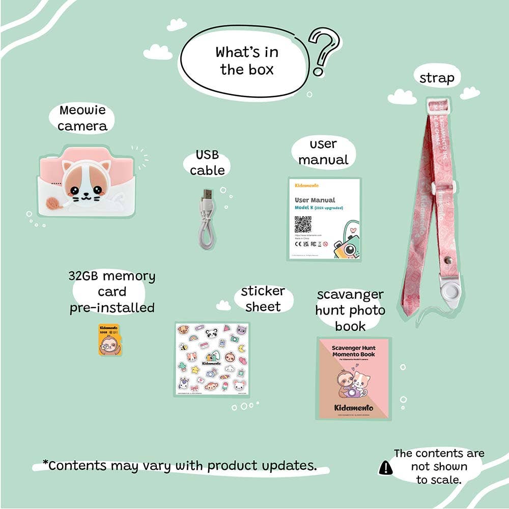 Model K is the ultimate camera designed for kids aged 5 to 8. Its large HD touchscreen ensures effortless navigation, while the built-in selfie camera adds an extra element of fun. The camera's rear lens cap is conveniently attached to the soft silicone case, ensuring added protection. Allow us to introduce you to Meowie the Cat, the delightful princess of the Model K family, ready to accompany your child on countless photo adventures.