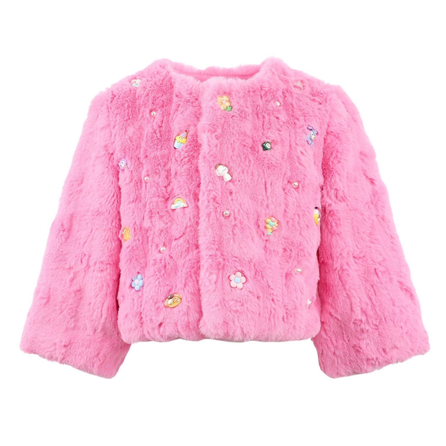- Add a burst of charm to any outfit with this delightful faux fur jacket adorned with colorful charms and pearl accents.