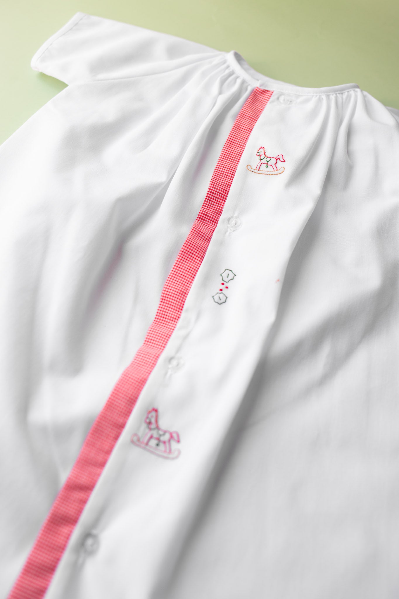 A timeless keepsake piece, this darling white day gown features precious hand-embroidered rocking horses and soft Christmas embroidery cascading down the front. A dainty strip of festive gingham adds the perfect touch of vintage charm, while the button-down design makes dressing effortless.