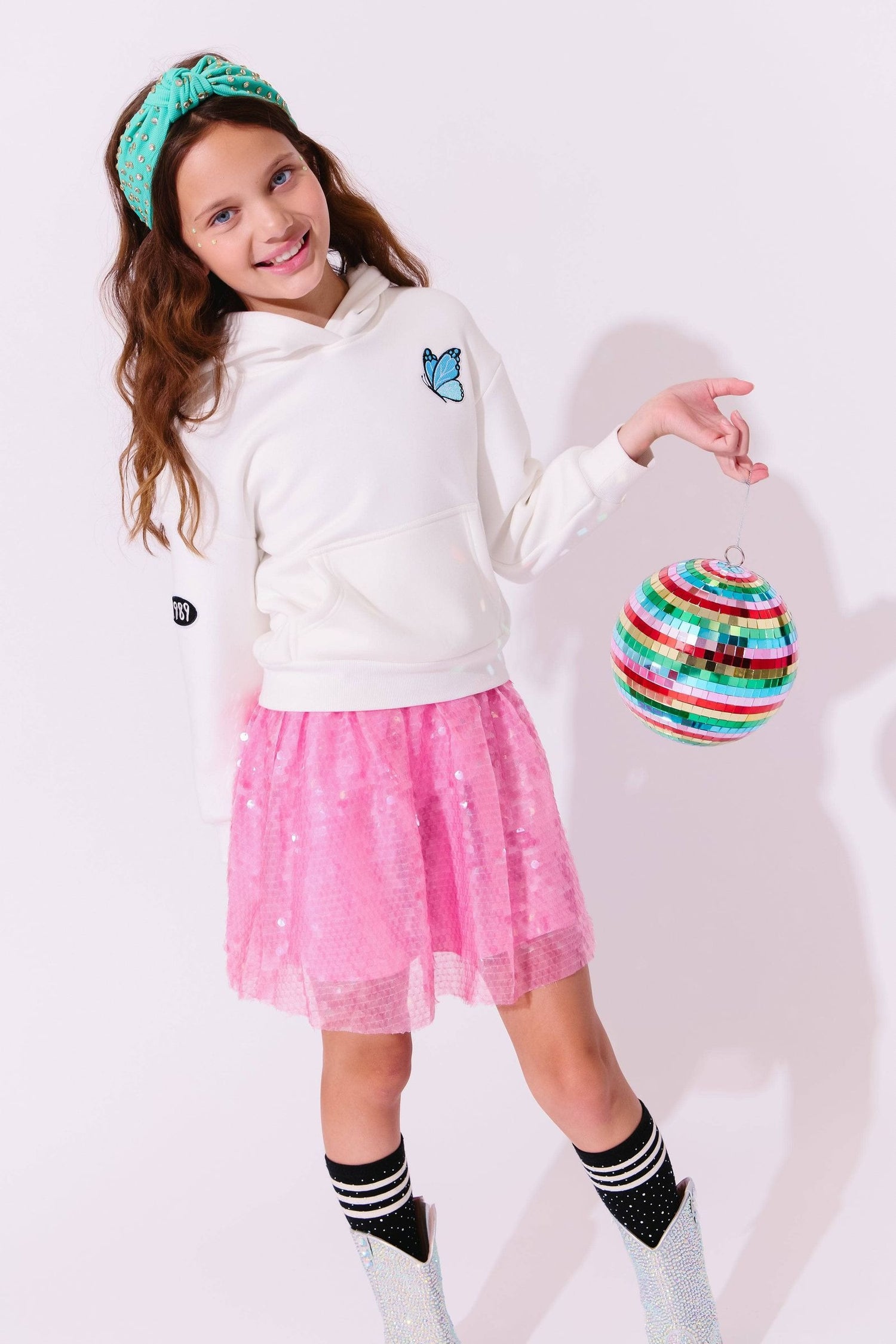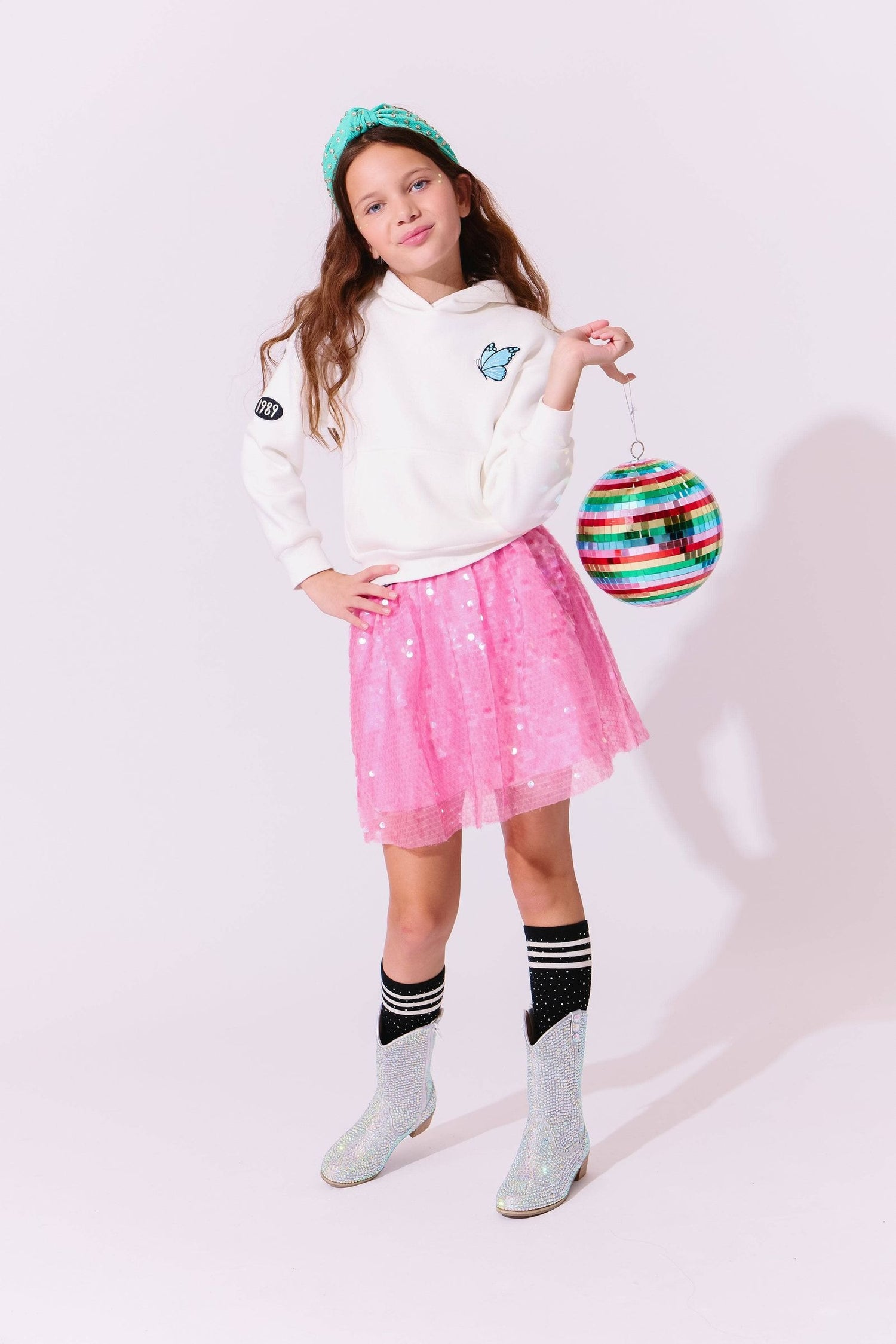 • Show off your fandom with the this hoodie, featuring a bold pink heart and sparkling "Swiftie" embroidery on the back.