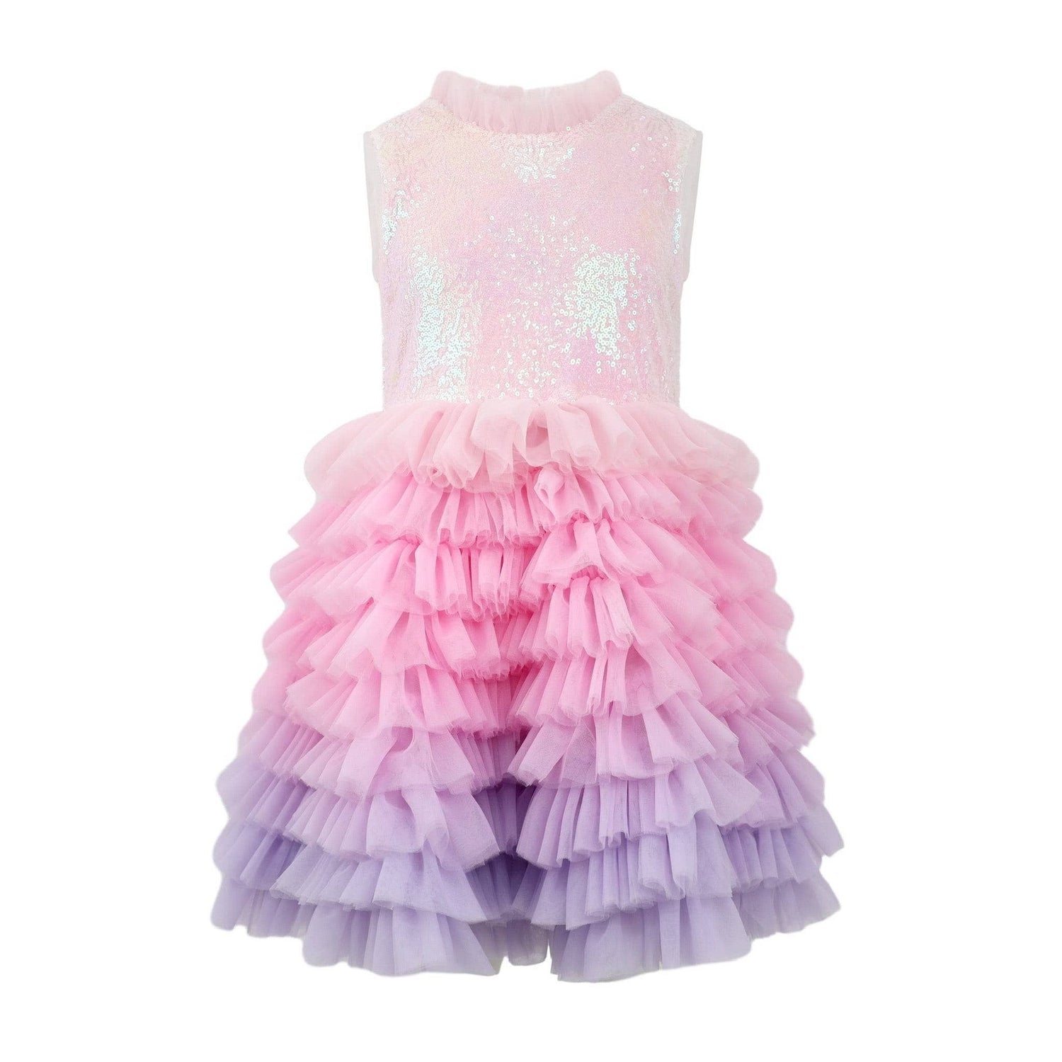 - Showcases a delightful gradient of pink to purple hues adorned with a glittering bodice, perfect for any festive occasion.