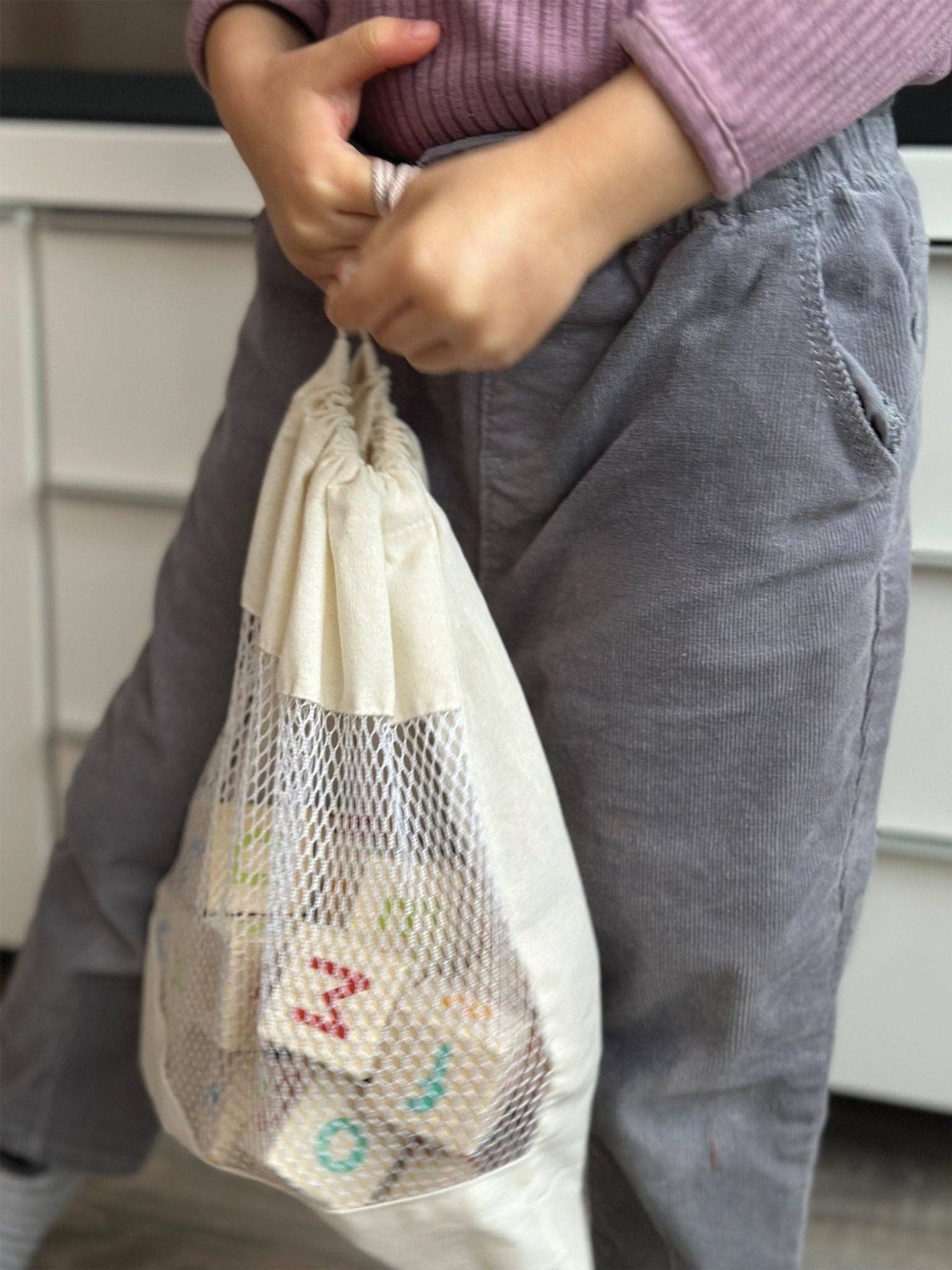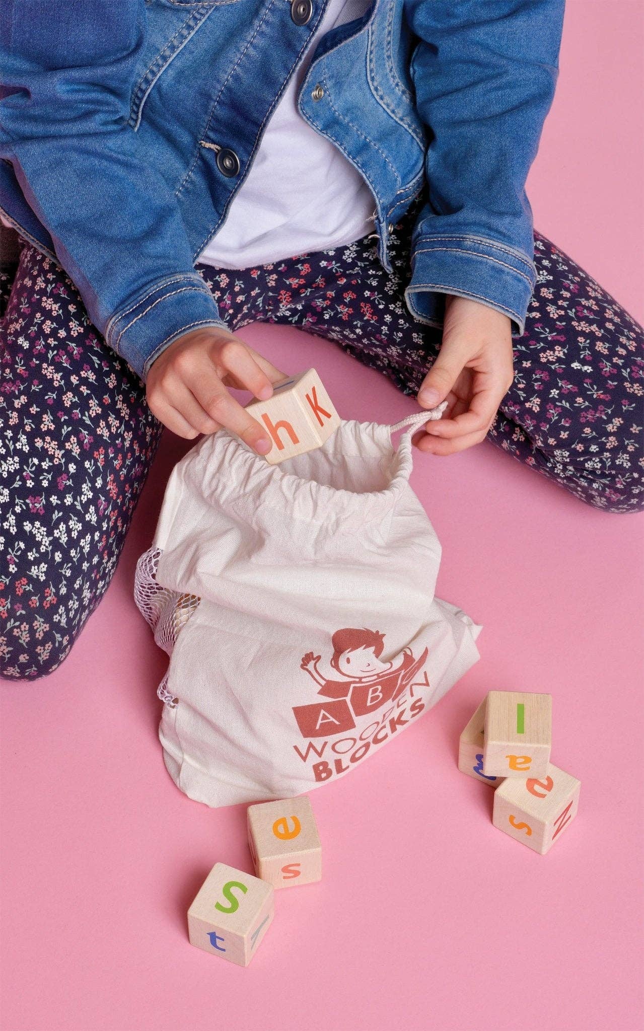 Stacking and spelling toy for children. Learn through play with 26 solid wood blocks decorated on all 6 faces with a colourful letter of the alphabet, presented in a printed drawstring bag. An introduction to spelling basic words, we have included both lower case and upper case letters with a good ratio of vowels to consonants ensure that most words and sentences can be created. A modern and stylish set that encourages a variety of early literacy skills and letter recognition.