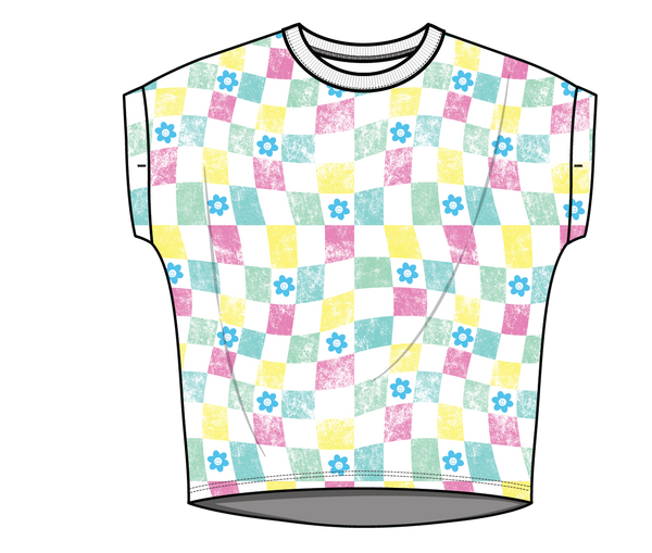 Multicolor daisy + checker print on drapey french terry.