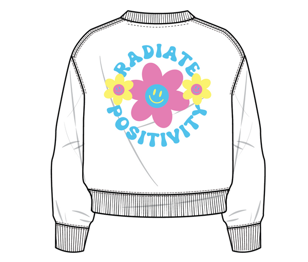 Daisy screen print on left chest and sleeves,'Radiate Positivity' design screen print on back.