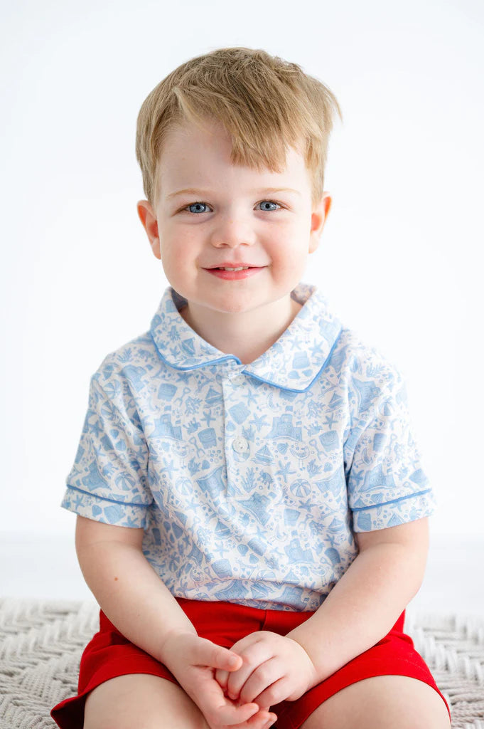 The Blue Pima Beach Motif Polo is a classic top for toddler and little boys, available in sizes 12M to 8. Made from 100% luxurious Pima cotton, this soft, breathable polo keeps little ones comfortable during warm-weather adventures.