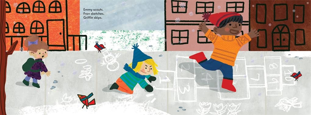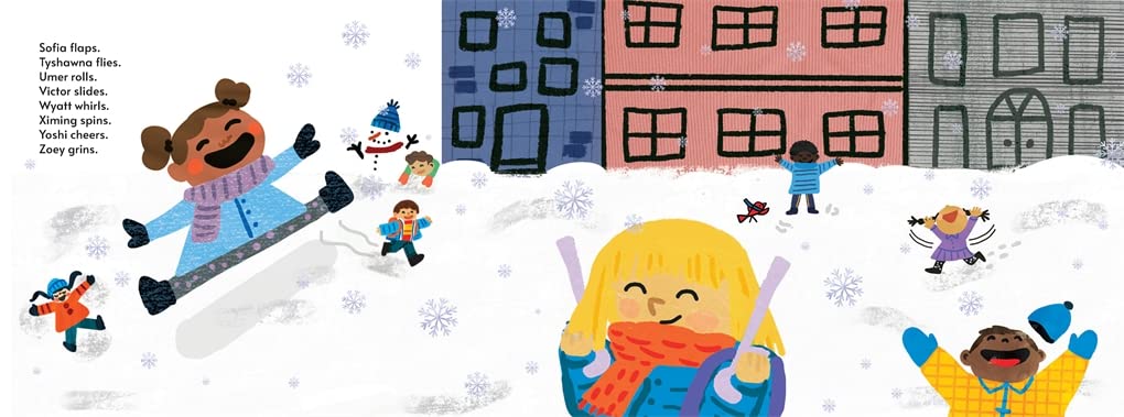 It’s time for school, and all the neighborhood kids from Antoine to Mahmoud to Zoey, gather one by one in the frosty dawn to wait for the school bus. But something more thrilling arrives first. Snowflakes fall, transforming the bus stop into a winter wonderland—and an official snow day. No school!