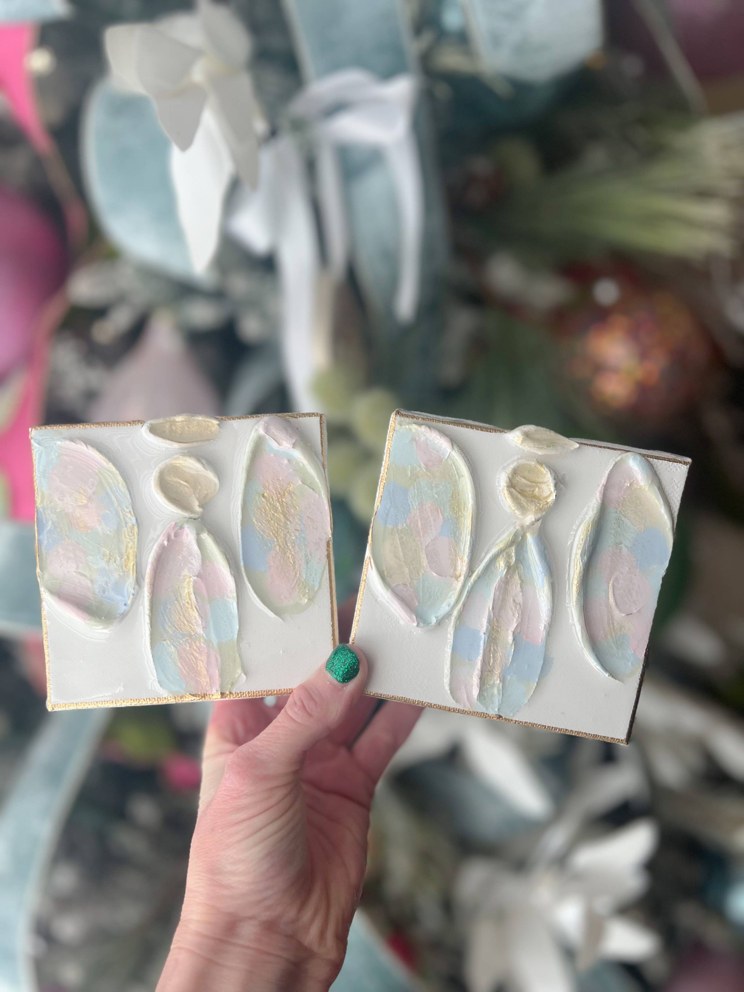 Raised painted angel finished with a glassy resin. Canvas. 4x4 inches.