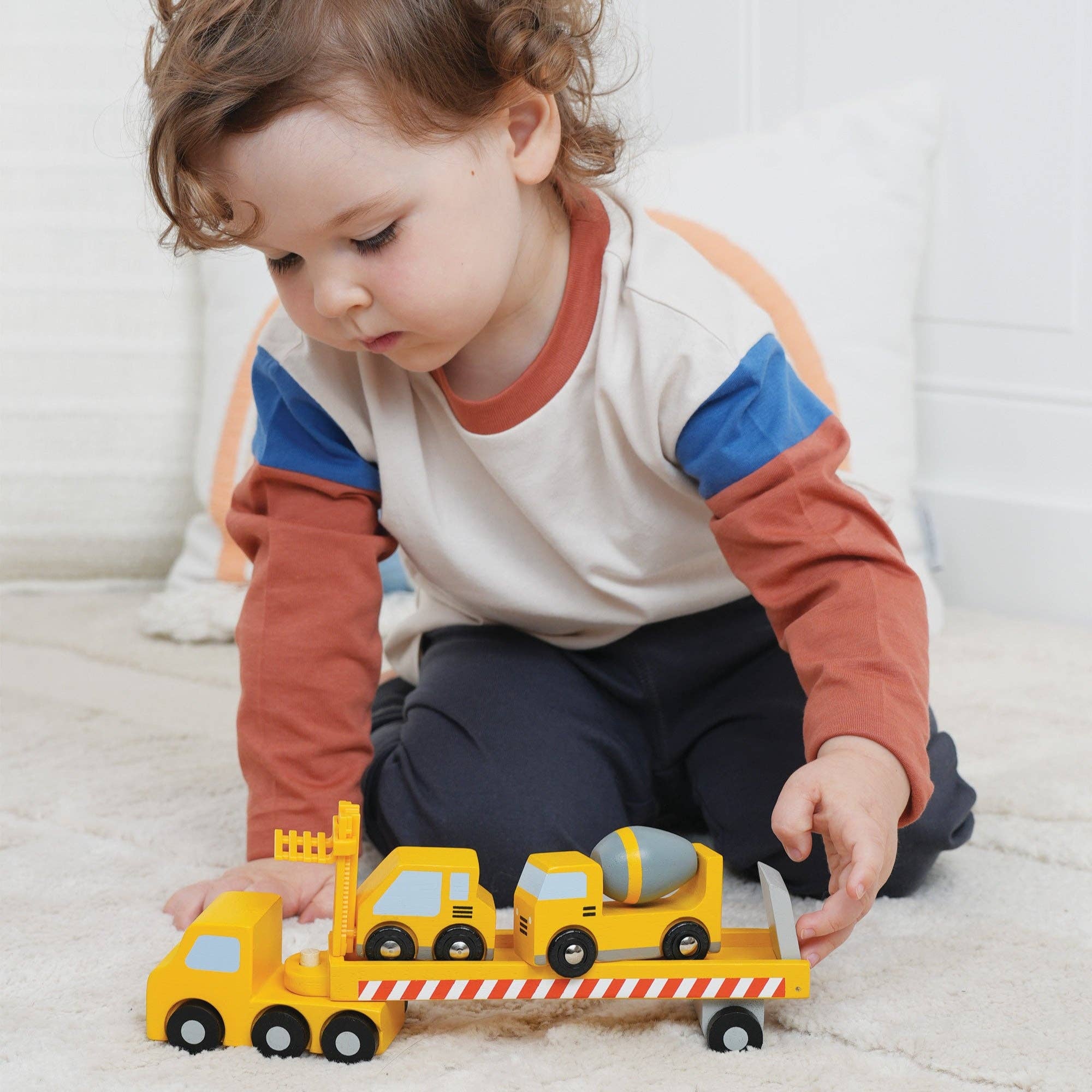 It's a transporter for the construction vehicles! A cement mixer and heavy lifter are being transported to a new building site! Trailer is detachable from the front cabin allowing extra play. Great for adding to our construction set and good for imaginative play.
