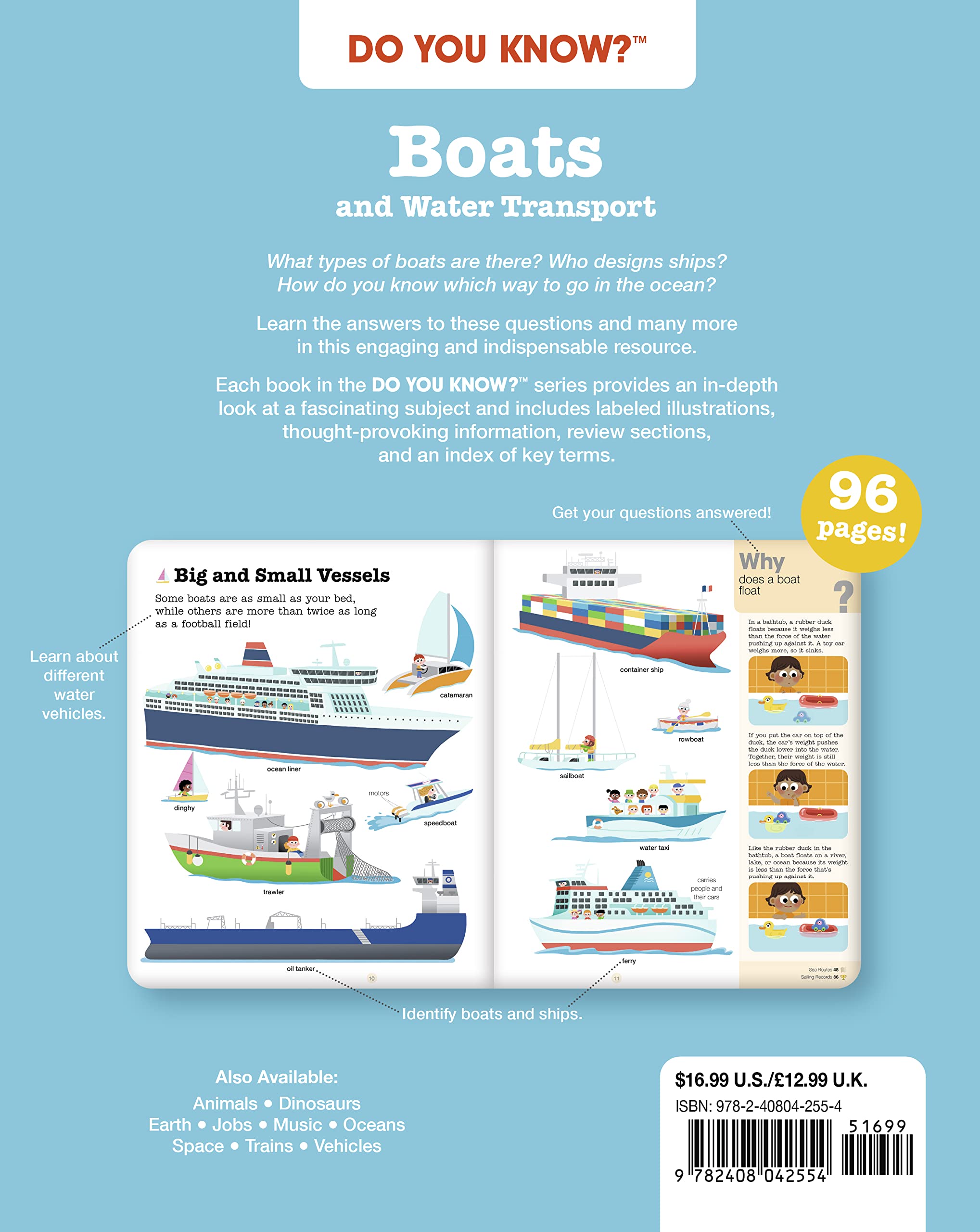 What types of boats are there? How do big ships float? Who works on boats and ships? The Do You Know?™ series provides in-depth looks at a wide range of popular subjects. Appealing to children who want to know everything, each thought-provoking book features: • 96 pages of engaging and educational answers to many popular questions • Hundreds of labeled full-color illustrations • An index to key terms Fans of this book will also enjoy others in the same series, including Jobs, Trains, Dinosaurs, Oceans, Space, Vehicles, Earth, and Animals. • Great family and classroom read-aloud book • Educational books for kids 5 to 8 • Nonfiction books for kids An indispensable resource for any child’s library!