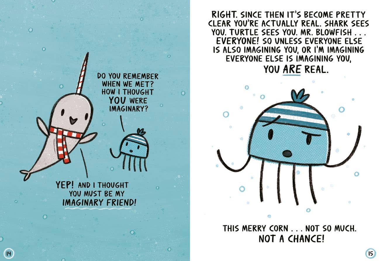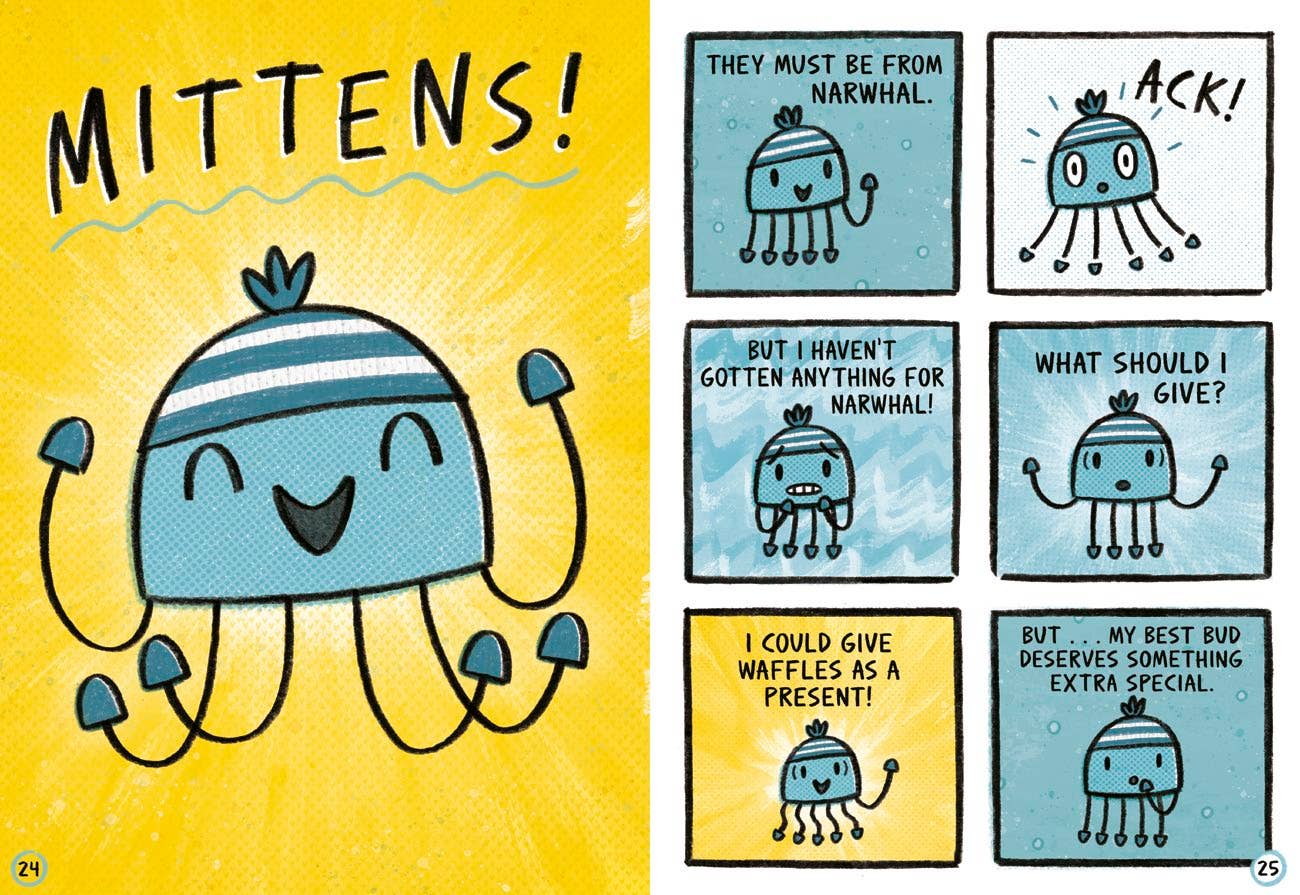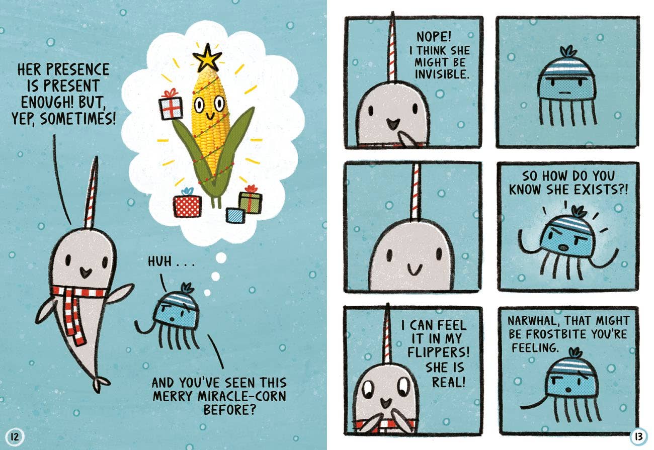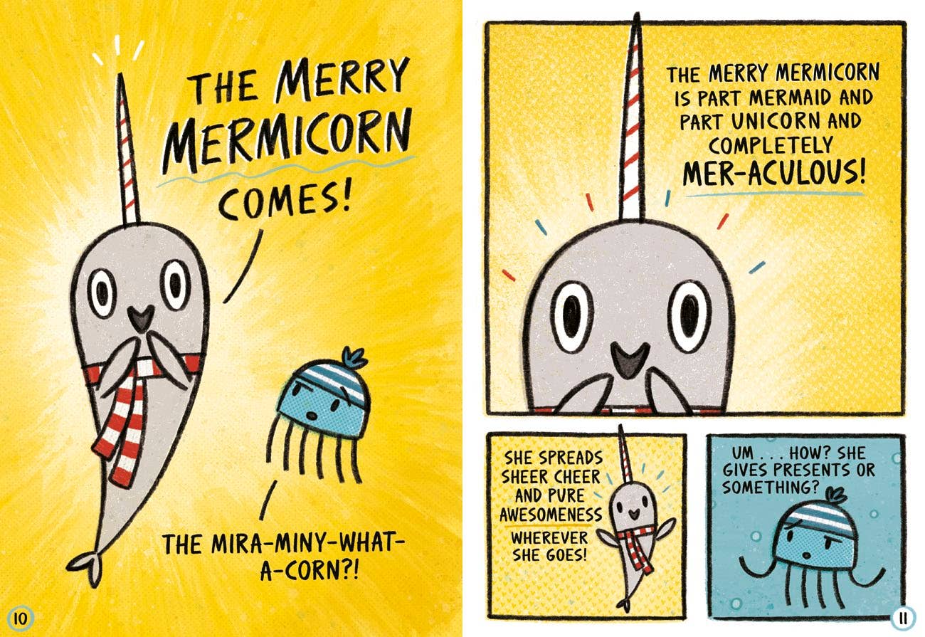 Dive into three stories about Narwhal's favorite time of the year! It's the festive season in the world wide waters, and Narwhal is looking forward to cozying up with a good book, singing and partying with pod pals and enjoying some warm waffle pudding. But most of all, Narwhal is excited about the arrival of the Merry Mermicorn! According to Narwhal, she's part mermaid, part unicorn and completely mer-aculous! Jelly is of course skeptical about the existence of the "Mira-Miny-What-A Corn" . . . even when he receives a mysterious present. It must be from Narwhal. Now Jelly has to get the perfect gift, but finding a present for someone as unique as Narwhal is no easy feat, even when you have six tentacles. How will Jelly ever come up with a whaley great gift for a best pal who spreads cheer all through the year?