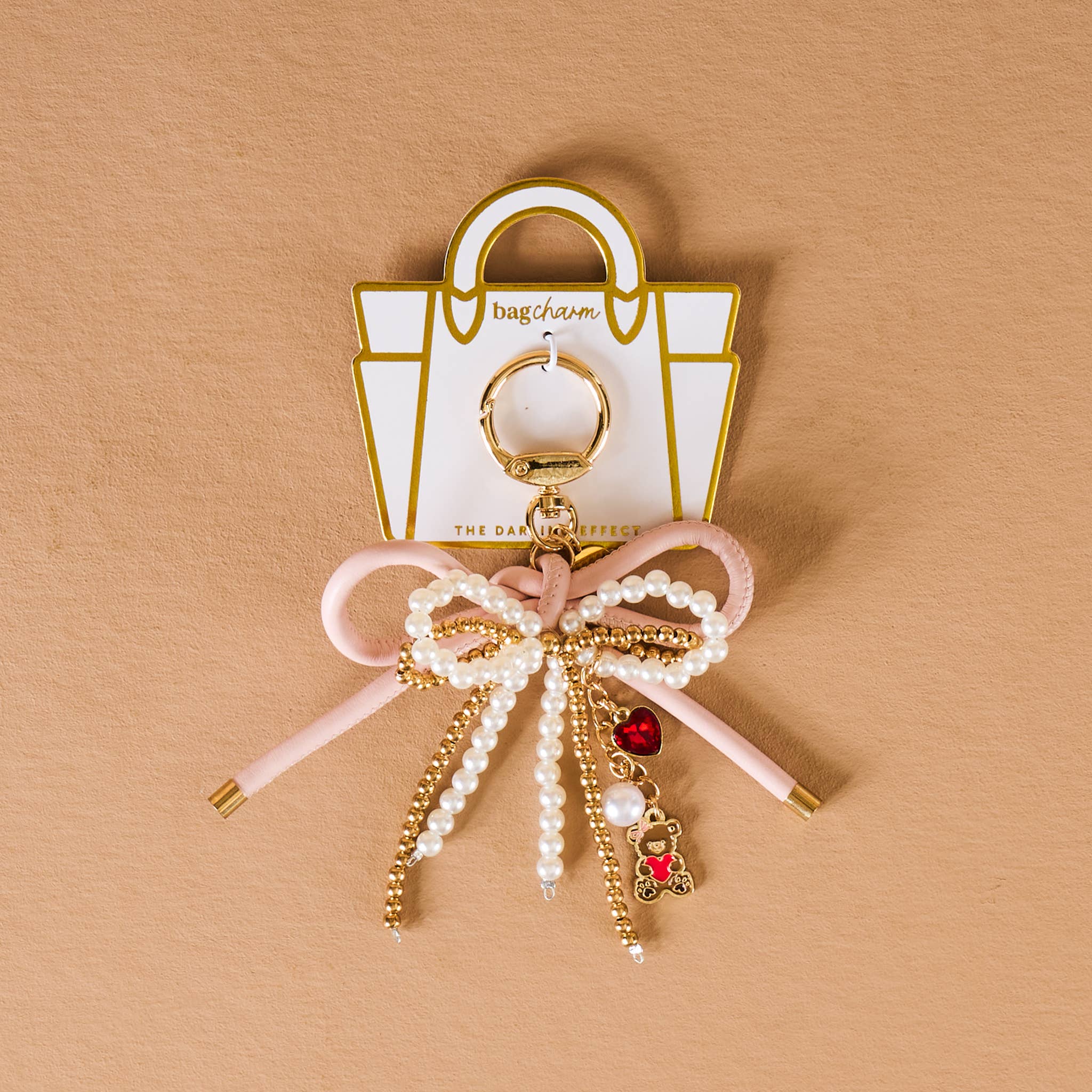 Elevate your everyday with our Layered Bows Bag Charm—a luxe little accessory stacked with style. Featuring a trio of bows in faux leather, pearls, and gold beading, this charm adds dimension and glamour to any bag. Finished with a delicate drop chain, coordinating mini charms, and a gold clip for easy attachment, it’s the perfect mix of sweet, chic, and statement-making.