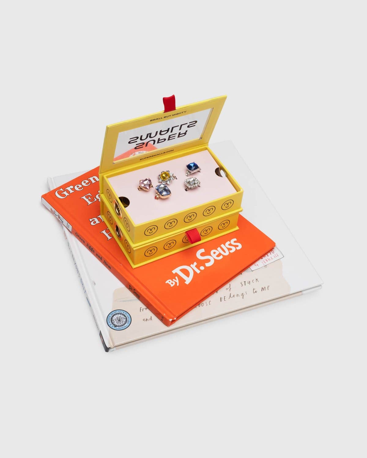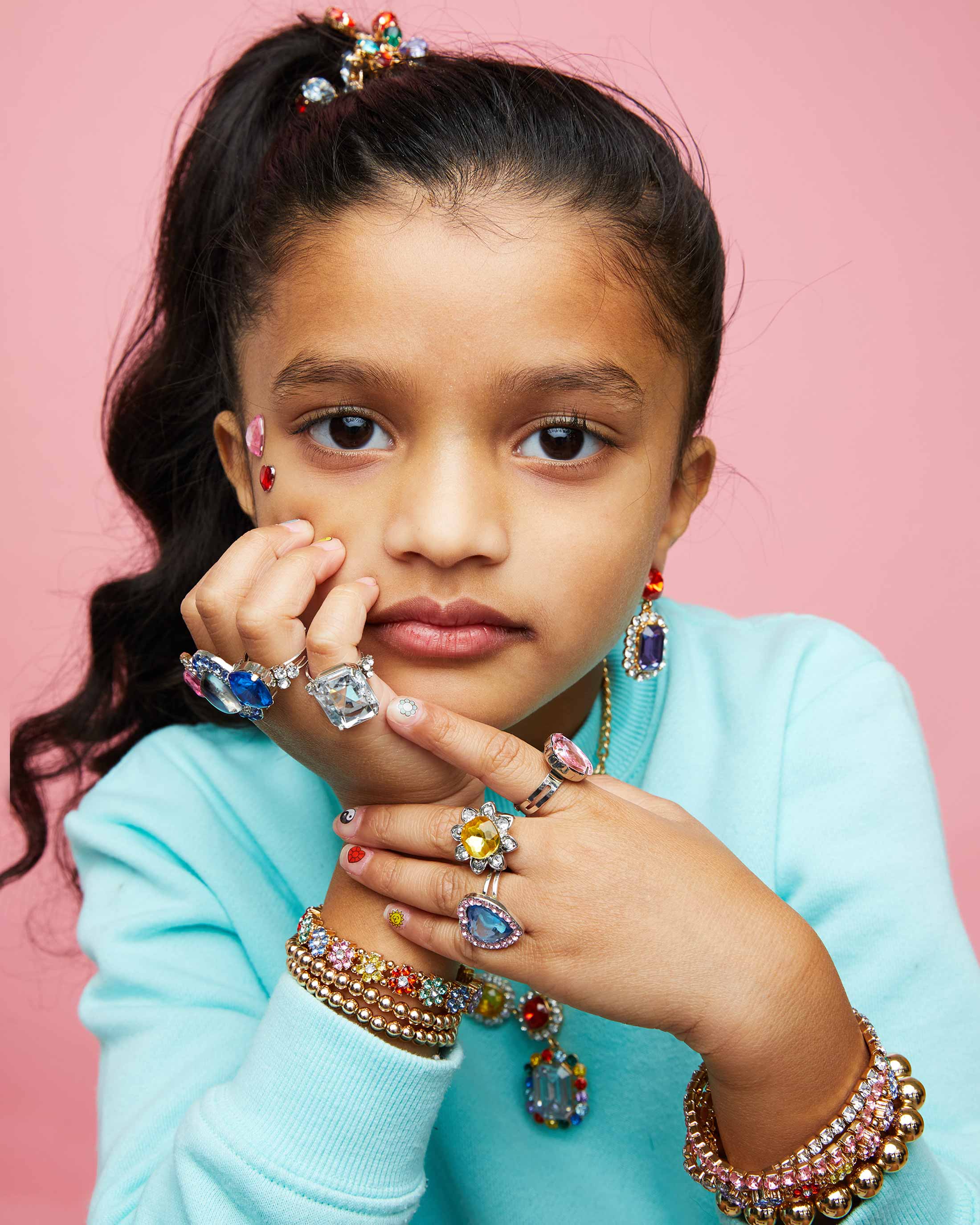 Grab your pals, we’re power-lunching! Swanky, stylish, and super sparkly, these rings are sure to make a statement when clinking your glass of apple juice. The set includes five rings featuring colorful and oversized gemstones—perfect for decking out both hands and creating your signature stack… or (if you must), sharing the sparkle with the table and matching with friends. *Small parts, not intended for children under 3 years