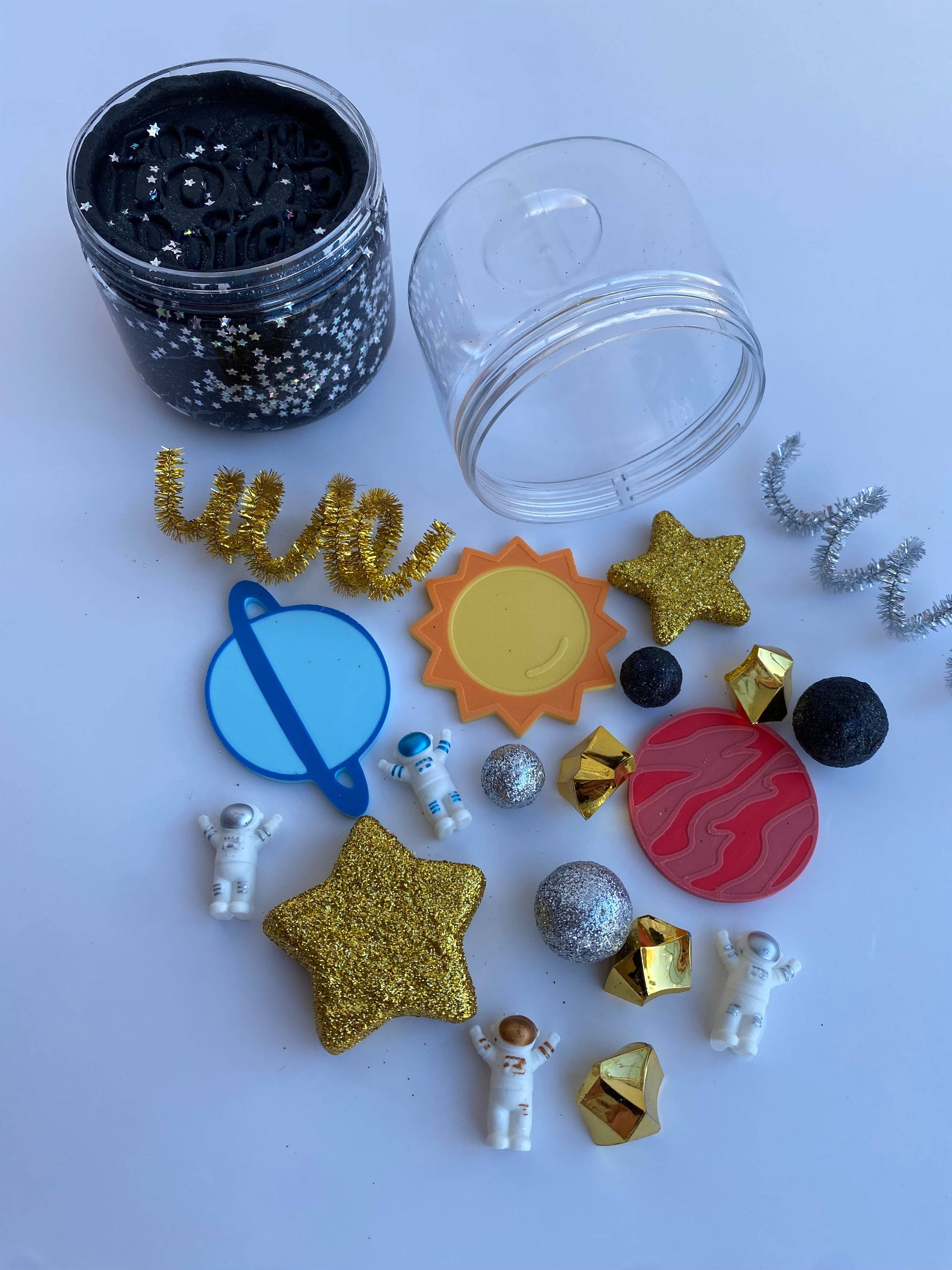 Blast off into imaginative play with our Outer Space double Jar! This screen-free creative kit sparks endless cosmic adventures through tactile, sensory exploration. Packed with shimmering glittery dough and planet pieces, it's the perfect companion for building your own galactic worlds—anytime, anywhere. Warning: Contains small parts; not intended for children under 3.