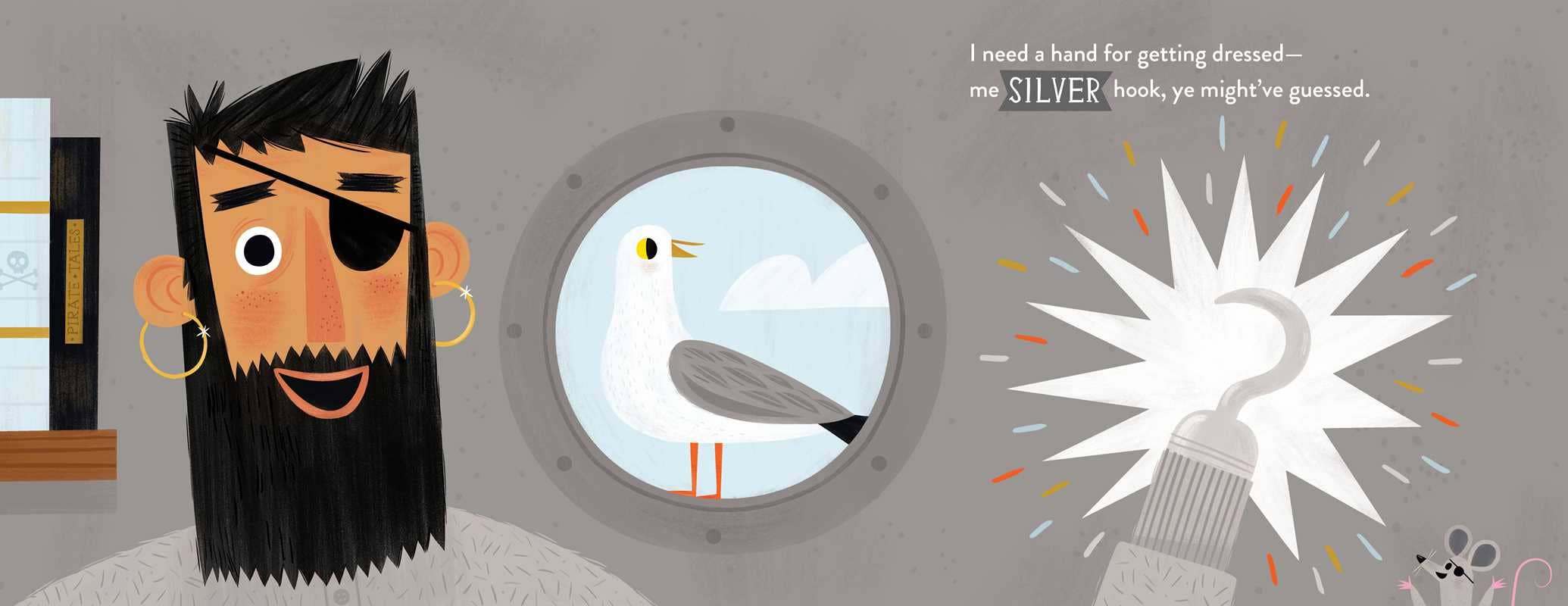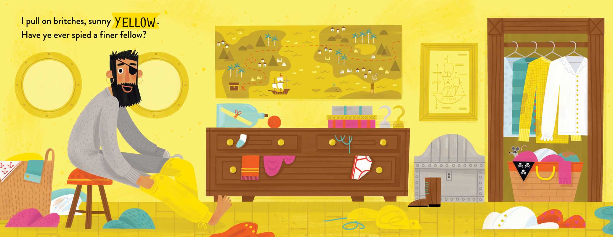 It’s the crack o’ dawn, and dapper Pirate Jack is ready t’ get dressed for a day out on the high seas with his motley crew. He’ll need every color of the rainbow to make his outfit complete—from his itchy gray long johns and his toasty pink socks to his bright red sash and his cozy purple coat. And he won’t be forgettin’ his black eye patch and trusty brown peg leg, either!