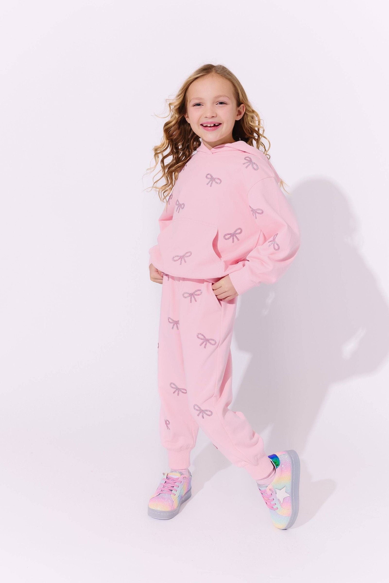 - Adorable two-piece set featuring a hoodie and joggers, both adorned with sparkling crystal bow embellishments.