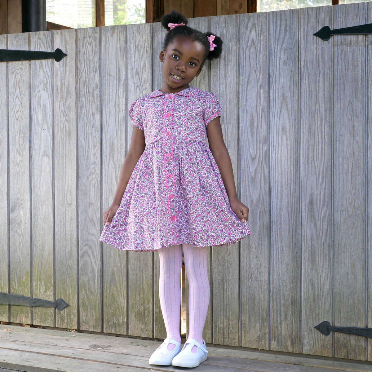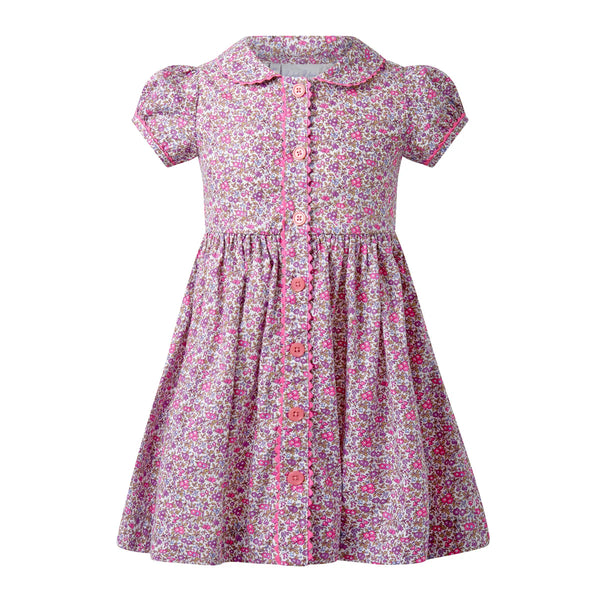 New! A Rachel Riley favourite, this Floral Button-front Dress is the perfect blend of style and function. Featuring a cute floral print is shades of pink and purple, this dress is completed with matching pink trimming and buttons for a timeless look.