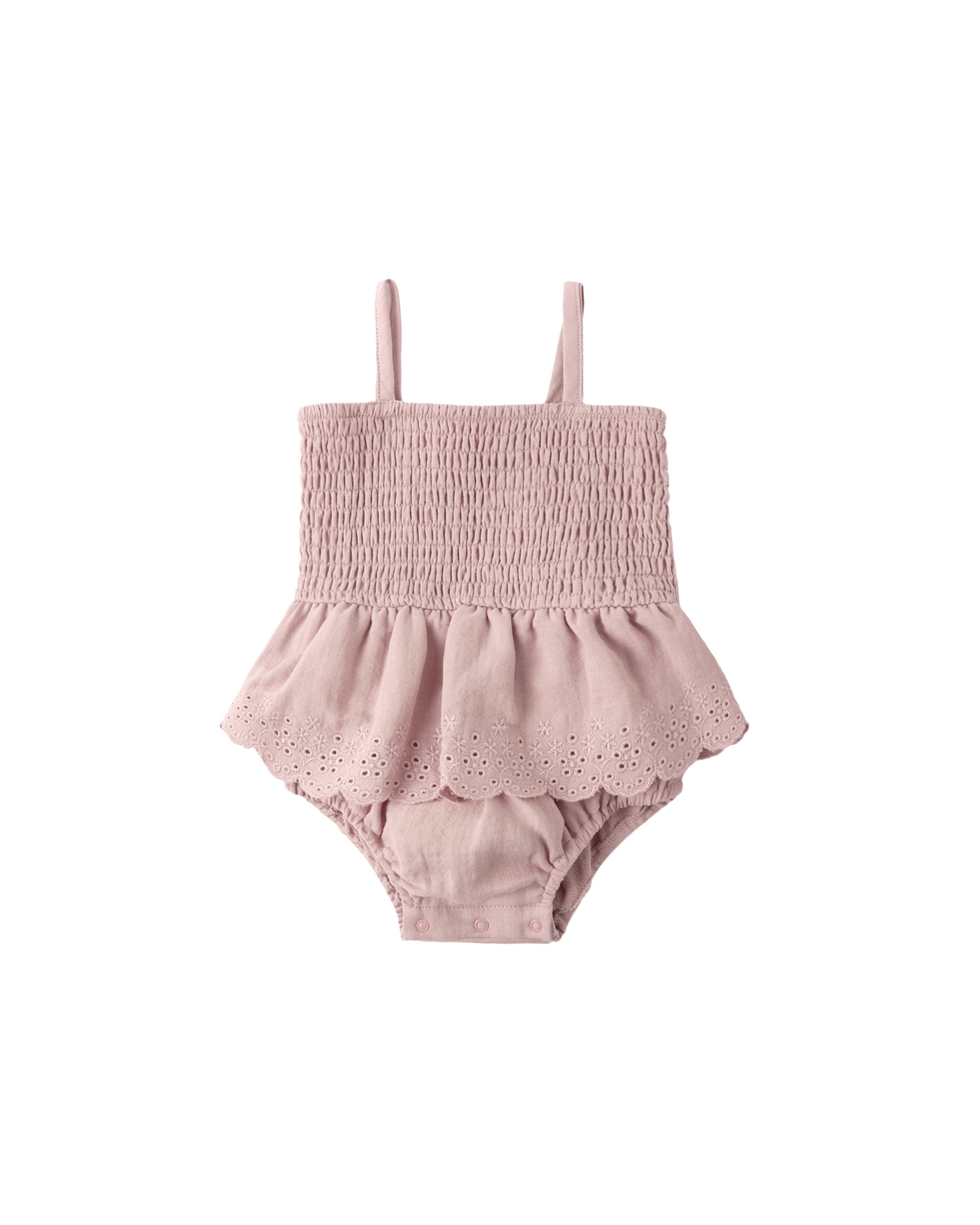 SMOCKED SKIRTED ROMPER MAUVE