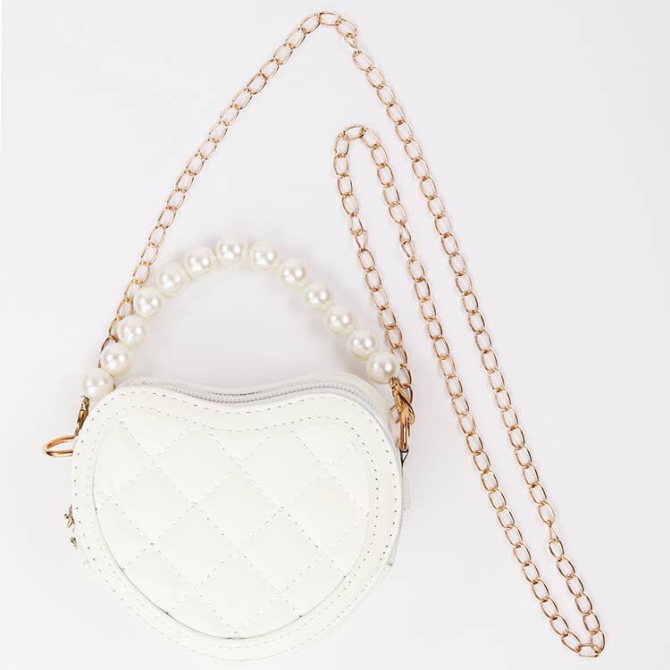 Cute Faux leather quilted heart purse. Gold cross body strap included. Cute pearl handle. Great for everyday wear and for Valentine’s Day too.