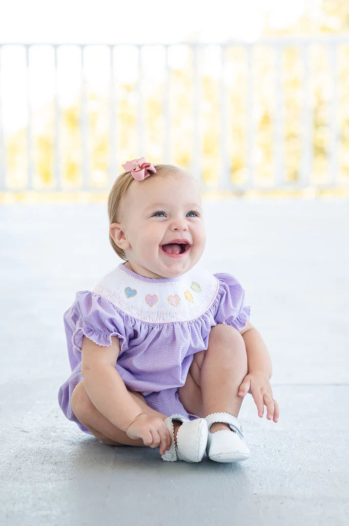 The Smocked Rainbow Hearts Bubble is a timeless, heirloom-quality style for your sweetest little Valentine. Made from a soft 45% Polyester / 55% Cotton blend, this precious bubble features a purple micro gingham fabric with smocked pastel rainbow hearts in shades of blue, purple, pink, yellow, and green. Perfect for Valentine’s Day, photos, parties, and special events, it’s a classic keepsake piece you’ll love for years to come.