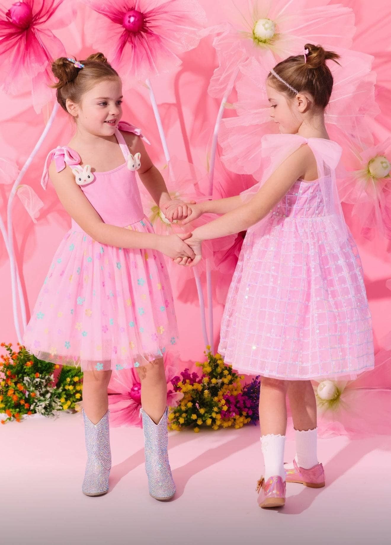 - A charming pink tank dress with a sheer grid overlay adorned in iridescent sequins