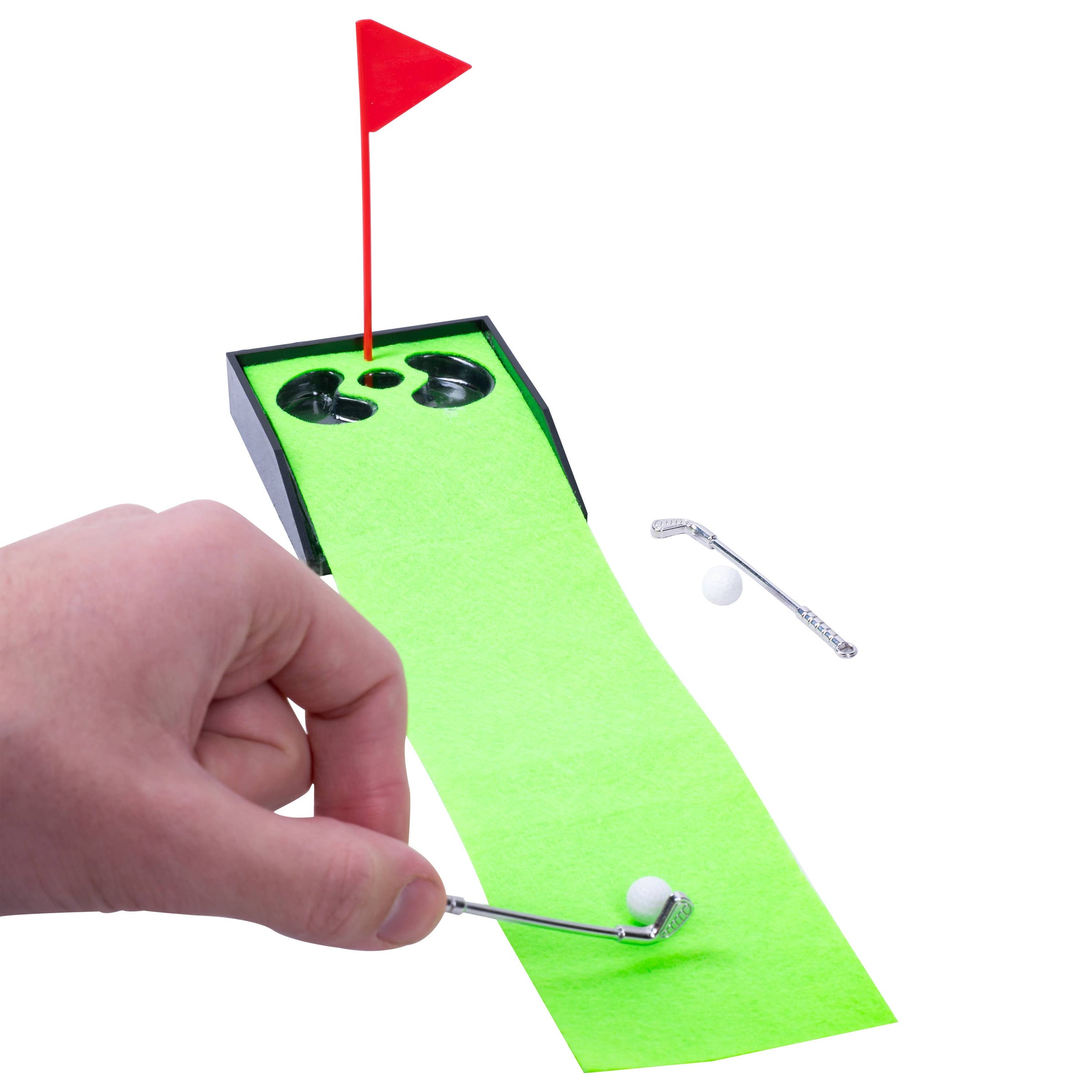 Tee up and get ready for a hole-in-one with Teeny Town Golf! This miniature golf set allows you to enjoy the excitement of the fairway in a compact and novelty format. Set up the tiny obstacles and navigate your way through the challenging holes using the included mini golf putter and ball.