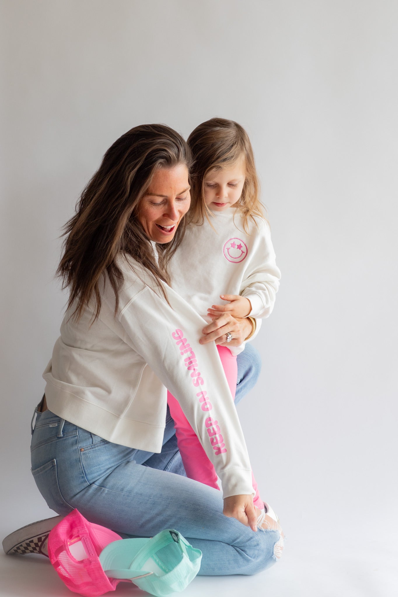 'Keep on Smiling' Printed on right sleeve, embroidered smiley on chest